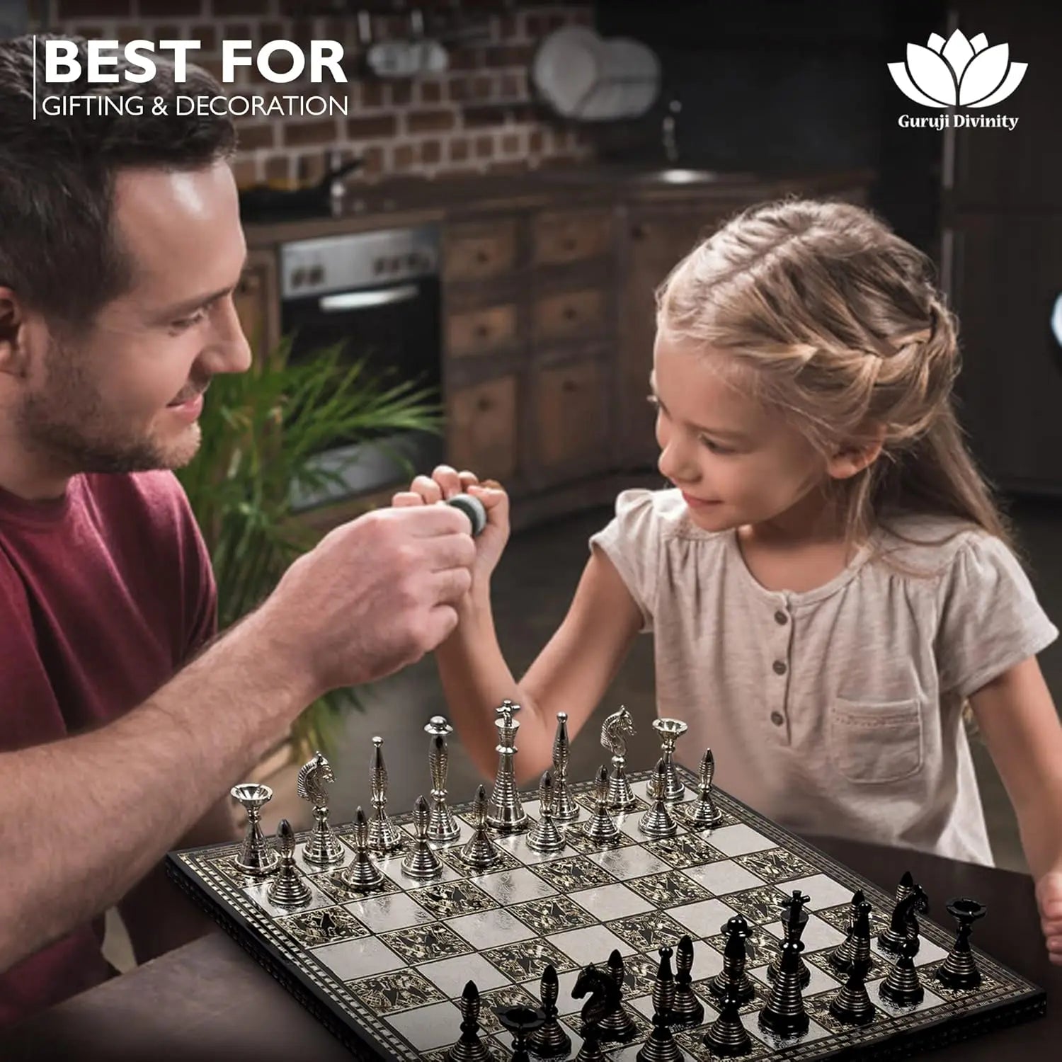 - You’ll play on a 12x12-inch brass board mounted on a solid wood base for a stable, luxurious surface with a striking centerpiece impact.